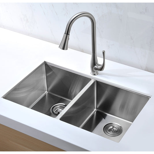 ANZZI Moore Series 32" Double Basin 50/50 Stainless Steel Undermount Kitchen Sink With Strainer, Drain Assembly and Brushed Nickel Accent Faucet