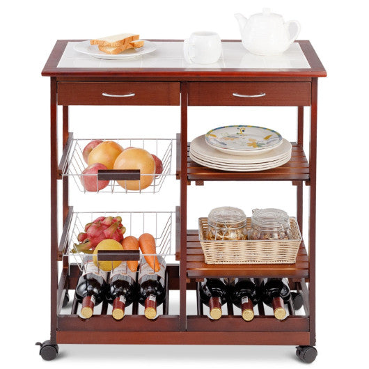 Costway Red Rolling Wood Kitchen Trolley Cart Island Shelf w/ Storage Drawers Baskets New