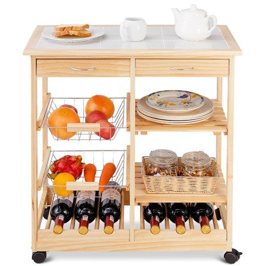Costway Natural Rolling Wood Kitchen Trolley Cart Island Shelf w/ Storage Drawers Baskets New