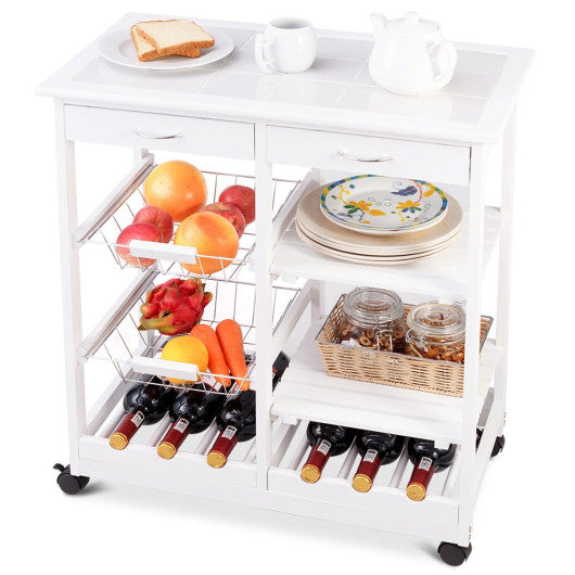 Costway White Rolling Wood Kitchen Trolley Cart Island Shelf w/ Storage Drawers Baskets New