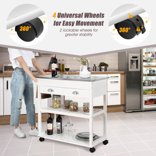 Costway White Rolling Kitchen Trolley Cart Island with Stainless Steel Countertop