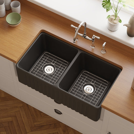 DeerValley Eclipse 33" Double Bowl Rectangular Black Cermic Reversible Farmhouse Kitchen Sink With Basket Strainer Drain and Grid