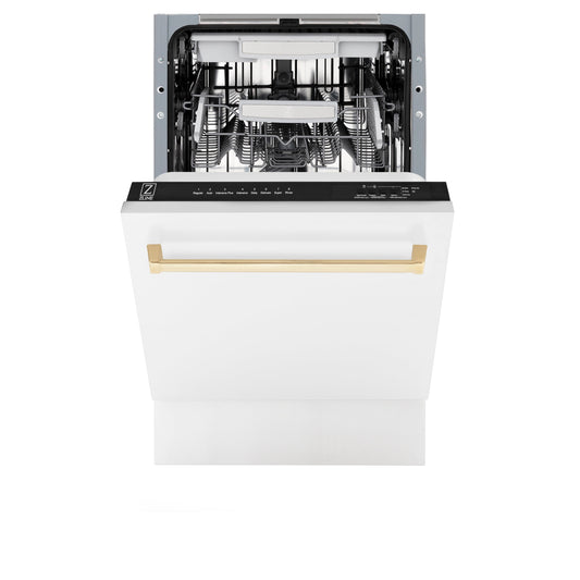 ZLINE Autograph Edition 18" White Matte Compact 3rd Rack Top Control Dishwasher With Gold Handle