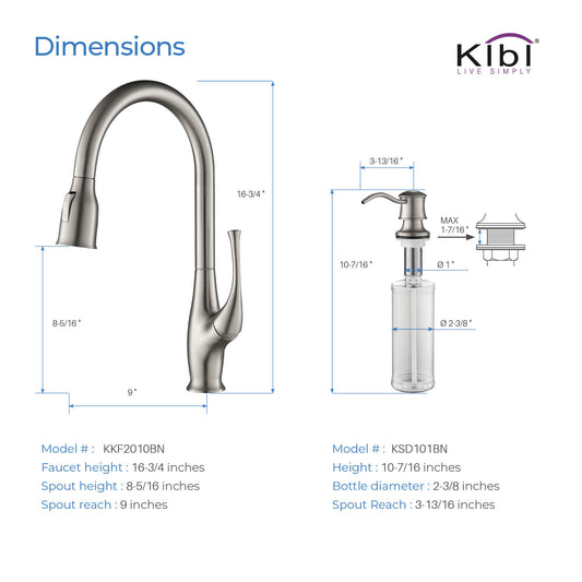 Kibi Cedar Single Handle High Arc Pull Down Kitchen Faucet With Soap Dispenser in Brushed Nickel Finish