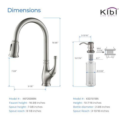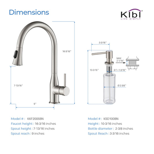 KIBI Napa Single Handle High Arc Pull Down Kitchen Faucet With Soap Dispenser in Brushed Nickel Finish