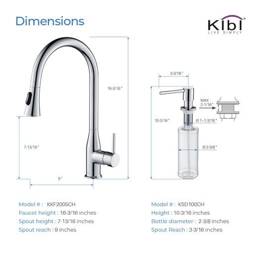 KIBI Napa Single Handle High Arc Pull Down Kitchen Faucet With Soap Dispenser in Chrome Finish