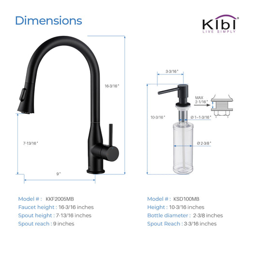 Kibi Hilo Single Handle High Arc Pull Down Kitchen Faucet With Soap Dispenser in Matte Black Finish