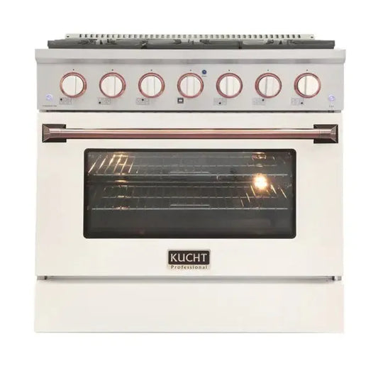 Kucht KNG Series 36" White Custom Freestanding Natural Gas Range With 6 Burners, White Knobs and Rose Gold Handle