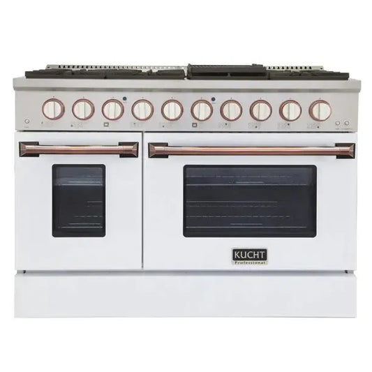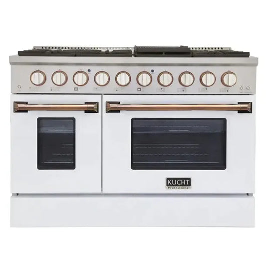 Kucht KNG Series 48" White Custom Freestanding Natural Gas Range With 8 Burners, White Knobs and Rose Gold Handle