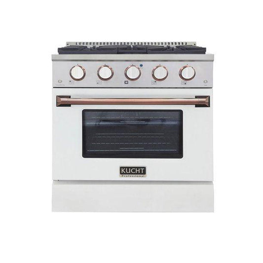 Kucht KDF Series 30" White Custom Freestanding Natural Gas Dual Fuel Range With 4 Burners, White Knobs and Rose Gold Handle