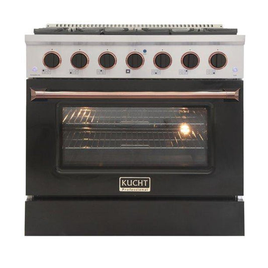 Kucht KDF Series 36" Black Custom Freestanding Natural Gas Dual Fuel Range With 6 Burners, Black Knobs and Rose Gold Handle