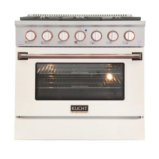 Kucht KDF Series 36" White Custom Freestanding Natural Gas Dual Fuel Range With 6 Burners, White Knobs and Rose Gold Handle