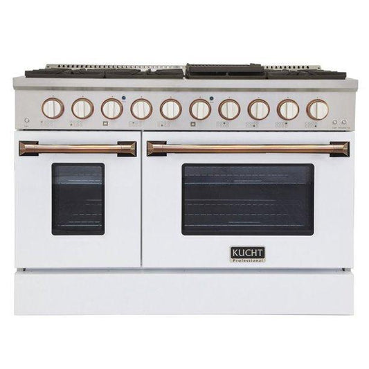 Kucht KDF Series 48" White Custom Freestanding Natural Gas Dual Fuel Range With 8 Burners, White Knobs and Rose Gold Handle