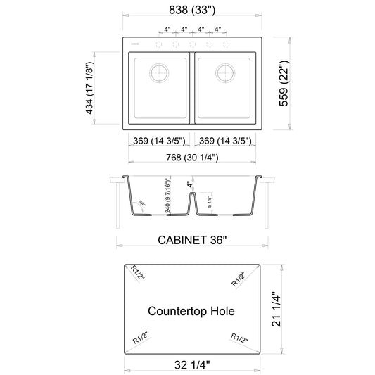 LaToscana Plados 33" x 22" x 10'' Black Metallic Double Bowl Granite Drop-in Kitchen Sink for 36'' Cabinet