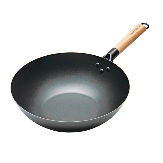 MASTERPAN Classico Series 12” Carbon Steel Wok With Glass Lid and Wooden Utensils, Non-stick Flat Bottom Asian Stir-Fry Cookware With Wooden Handle