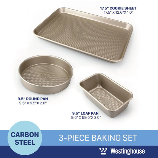 Westinghouse 3-Piece Carbon Steel Premium Non-stick Baking Pan Set With Loaf Pan, Round Pan, and Cookie Tray