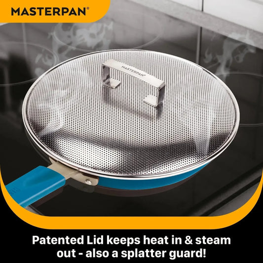 MASTERPAN Chef's Series 10” Azure Stovetop Oven Fry Pan & Skillet With Heat-in Steam-Out Lid, Healthy Ceramic Non-stick Aluminium With Stainless Steel Chef’s Handle, 2 Utensils and Felt Pan Protector