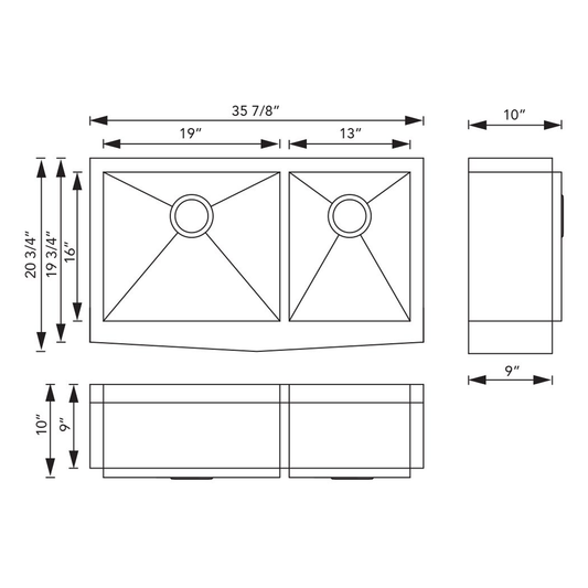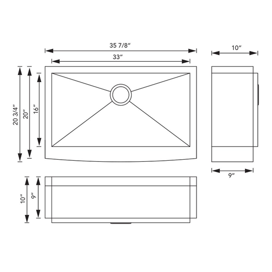 Pelican Int'l Handmade Series PL-HA125 R0 16 Gauge Stainless Steel Farmhouse Kitchen Sink 35 7/8" x 20 3/4" with Zero Radius Corners