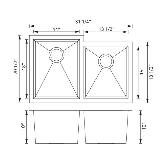 Pelican Int'l Handmade Series PL-HA126 R0 16 Gauge Stainless Steel Undermount Kitchen Sink 31 1/4" x 20 1/2" with Zero Radius Corners