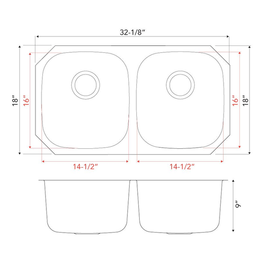 Pelican Int'l Signature Series PL-VS5050 ADA Compliant 18 Gauge Stainless Steel Double Bowl Undermount Kitchen Sink 32 1/8" x 18"
