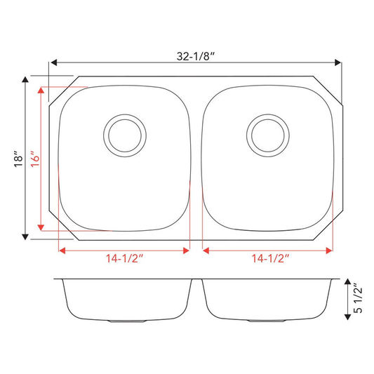Pelican Int'l Signature Series PL-VS5050 16 Gauge Stainless Steel Double Bowl Undermount Kitchen Sink 32 1/8" x 18"