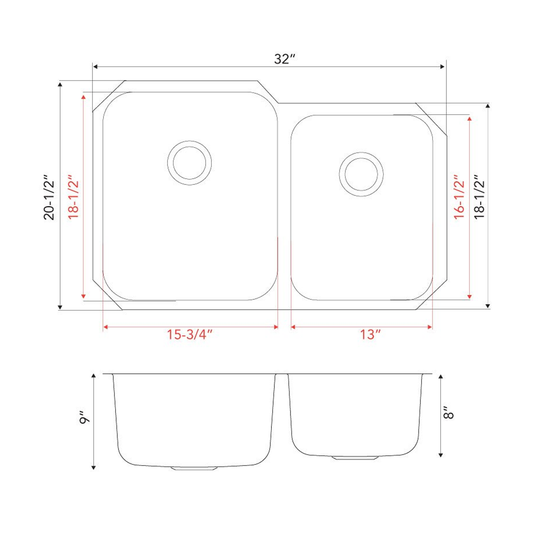 Pelican Int'l Handmade Series PL-HA115 R0 16 Gauge Stainless Steel Undermount Kitchen Sink 32" x 18" with Zero Radius Corners