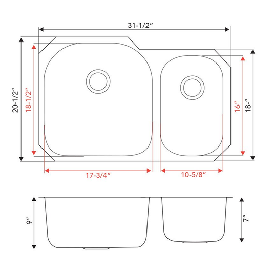 Pelican Int'l Signature Series PL-VS7030 18 Gauge Stainless Steel Double Bowl Undermount Kitchen Sink 31 1/2" x 20 1/2"