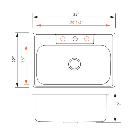Pelican Int'l Signature Series PL-VT3322 18 Gauge Stainless Steel Single Bowl Topmount Kitchen Sink 33" x 22" with 3 Holes
