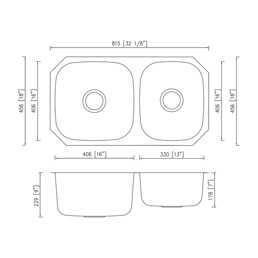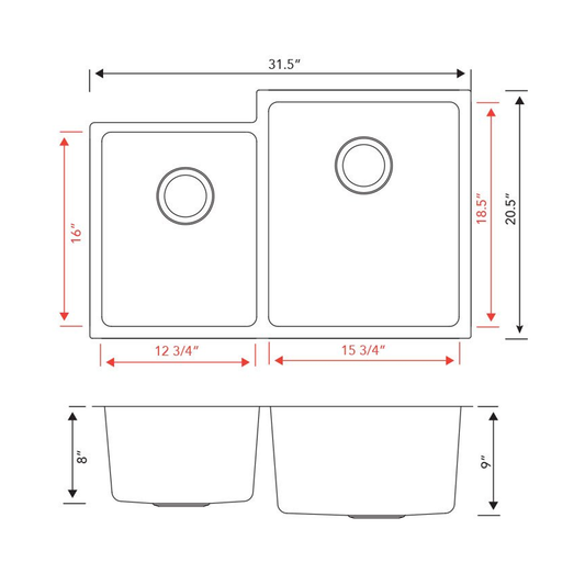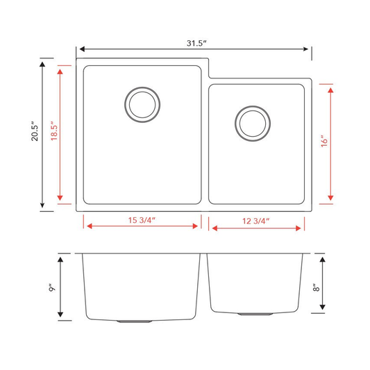 Pelican Int'l Urban Series PL-VR4060 R20 18 Gauge Stainless Steel Undermount Kitchen Sink 31 1/2" x 20 1/2" with Low Radius Corners