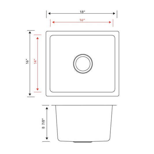 Pelican Int'l Urban Series PL-VR1816 R20 18 Gauge Stainless Steel Undermount Kitchen Sink 18" x 16" with Low Radius Corners