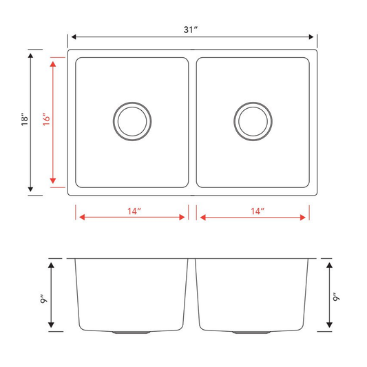 Pelican Int'l Urban Series PL-VR5050 R20 18 Gauge Stainless Steel Undermount Kitchen Sink 31" x 18" with Low Radius Corners