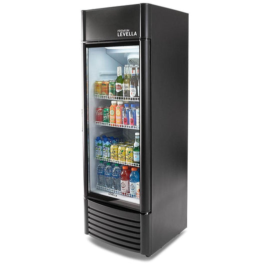 Premium Levella 9 Cu. Ft. Black Commercial Upright Beverage Display Refrigerator With Single Glass Door and Safety Lock - Holds 210pcs 12oz Cans