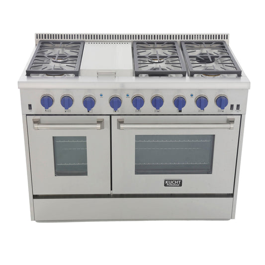 Kucht KRG Series 48" Freestanding Natural Gas Range With 6 Burners, Griddle and Royal Blue Knobs