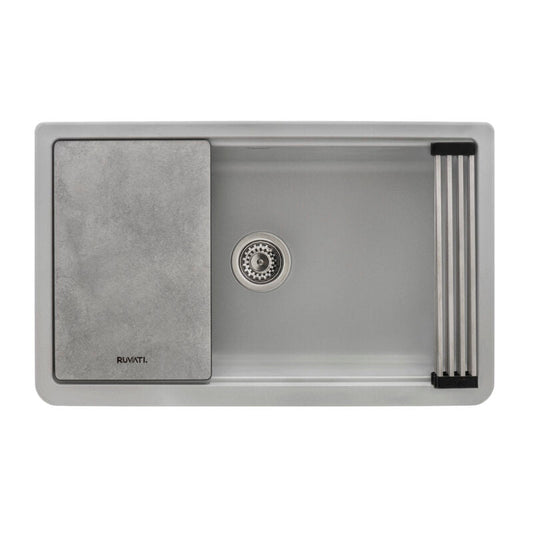 Ruvati epiCast 33” Matte Gray Farmhouse Granite Apron-Front Single Bowl Workstation Kitchen Sink With Basket Strainer, Bottom Rinse Grid and Drain Assembly