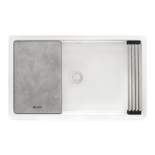 Ruvati epiStage 33” x 19” Arctic White Undermount Granite Single Bowl Workstation Kitchen Sink With Basket Strainer, Bottom Rinse Grid and Drain Assembly