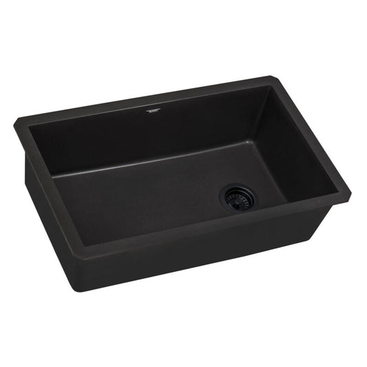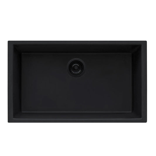 Ruvati epiGranite 30” x 18” Midnight Black Undermount Granite Single Bowl Kitchen Sink With Basket Strainer, Bottom Rinse Grid and Drain Assembly