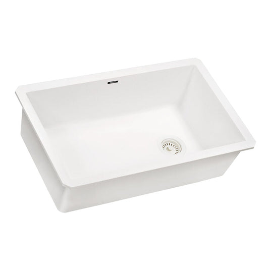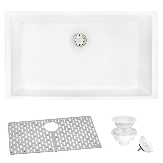 Ruvati epiGranite 30” x 18” Arctic White Undermount Granite Single Bowl Kitchen Sink With Basket Strainer, Bottom Rinse Grid and Drain Assembly