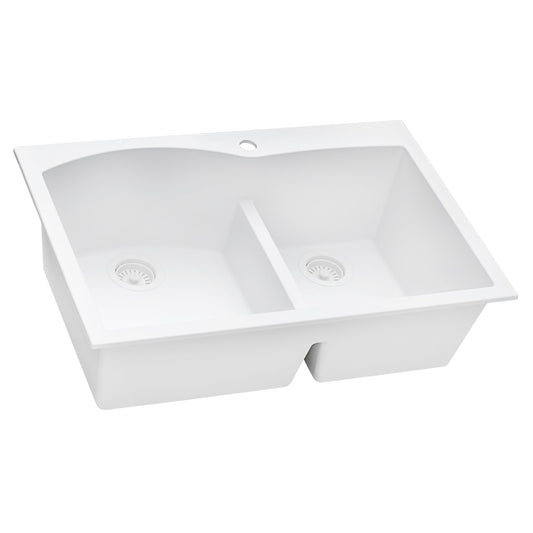 Ruvati epiGranite 33" x 22" Arctic White Dual-Mount Granite 60/40 Double Bowl Kitchen Sink With Basket Strainer and Drain Assembly
