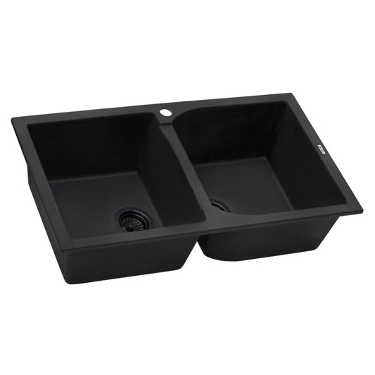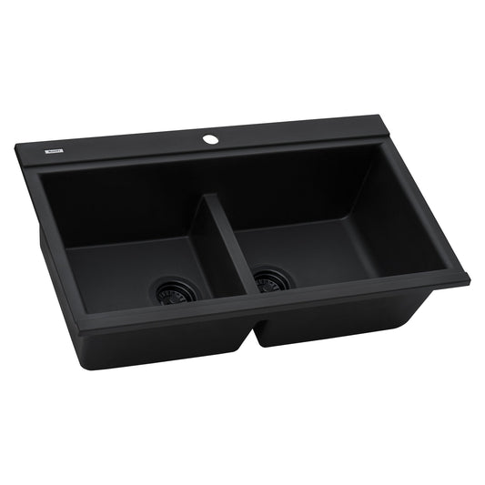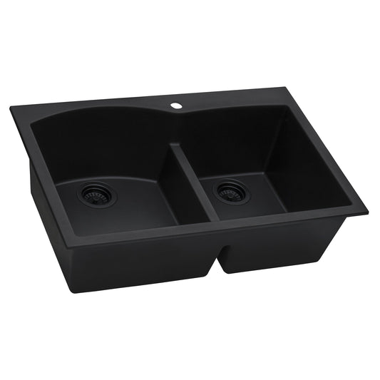 Ruvati epiGranite 33" x 22" Midnight Black Dual-Mount Granite 50/50 Double Bowl Kitchen Sink With Basket Strainer and Drain Assembly