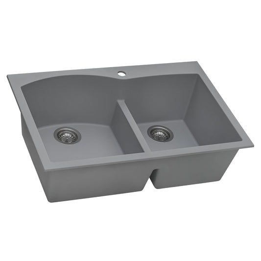 Ruvati epiGranite 33" x 22" Urban Gray Dual-Mount Granite 60/40 Double Bowl Kitchen Sink With Basket Strainer and Drain Assembly
