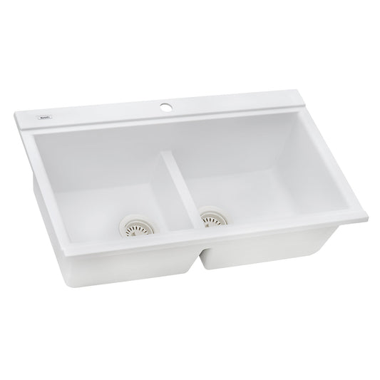 Ruvati epiGranite 33" x 22 Arctic White Drop-In Topmount Granite 60/40 Double Bowl Kitchen Sink With Basket Strainer and Drain Assembly