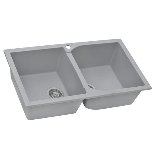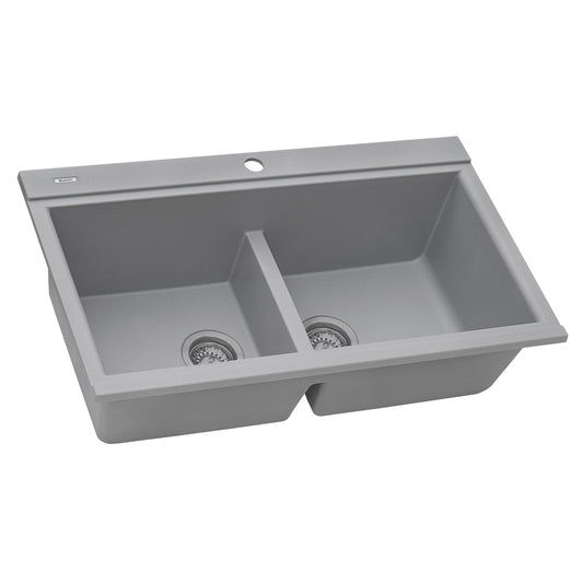 Ruvati epiGranite 33" x 22" Urban Gray Dual-Mount Granite 50/50 Double Bowl Kitchen Sink With Basket Strainer and Drain Assembly