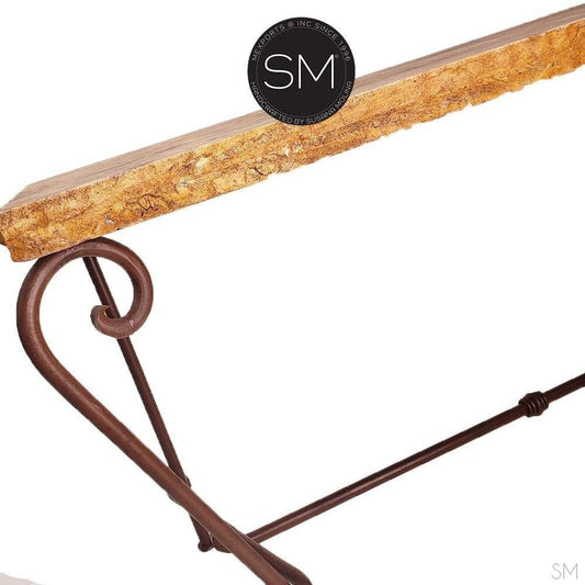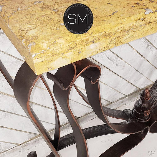 Mexports by Susana Molina 1242CM 72" Mesquite Wood Top Rounded Corners Gold Citrine Inlay Console Table With Iron Base