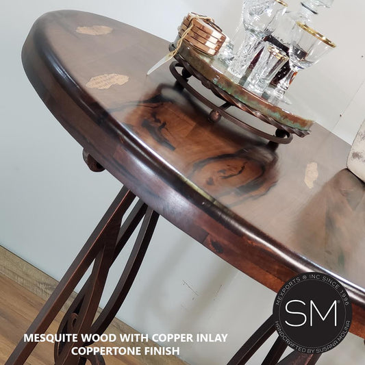 Mexports by Susana Molina 48" Mesquite Wood Top Bullnose Edge Elegant Round Bar Table With Hammer Copper Inlay