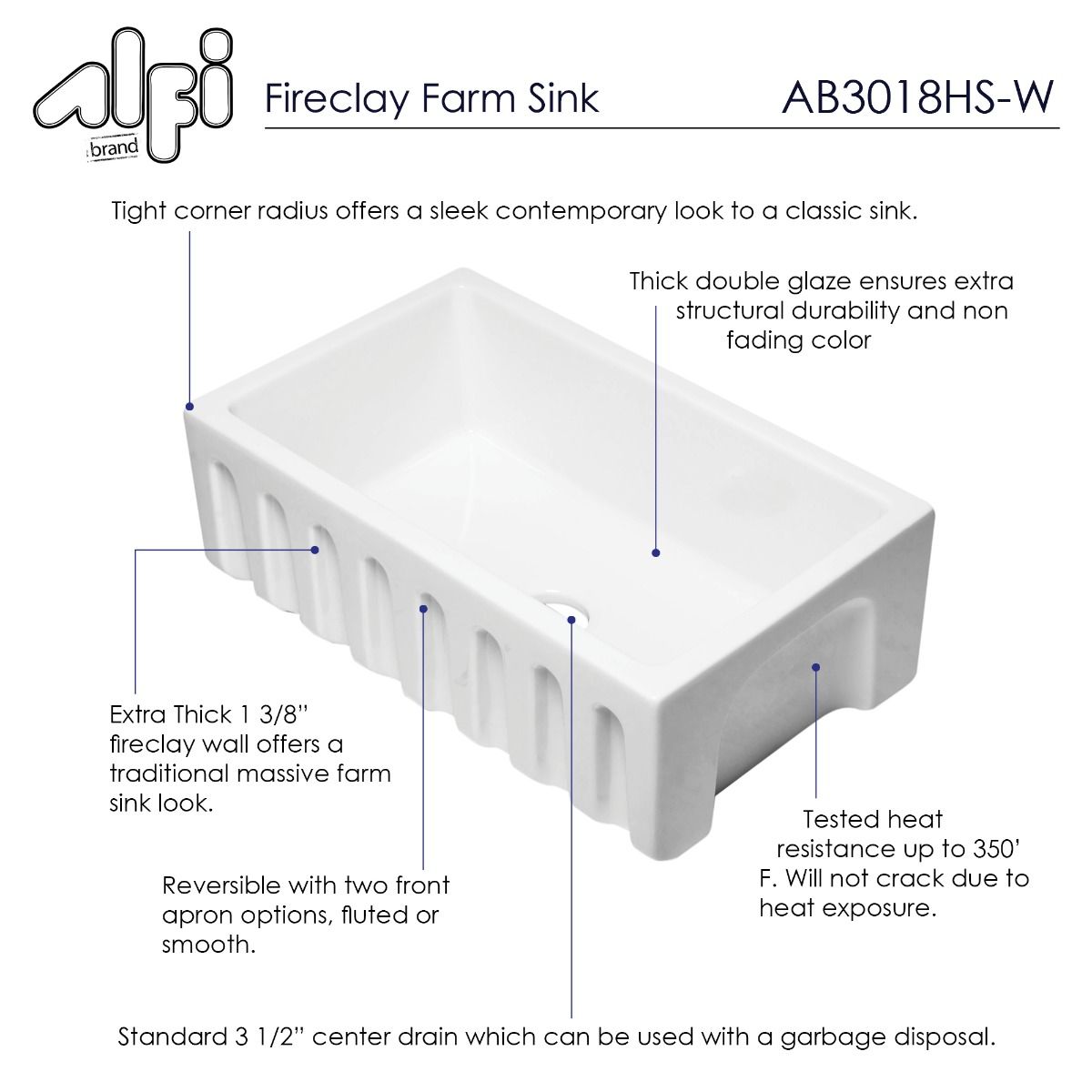 This 30 inch ALFI brand fireclay sink in white is designed to offer the traditional popular look of a farm sink with a touch of contemporary flair. Made of the highest quality extra thick solid fireclay and a rich white color for aesthetics and durability. Each sink is crafted with the highest grade of fireclay to ensure it not only looks great but also lasts you for a very long time.