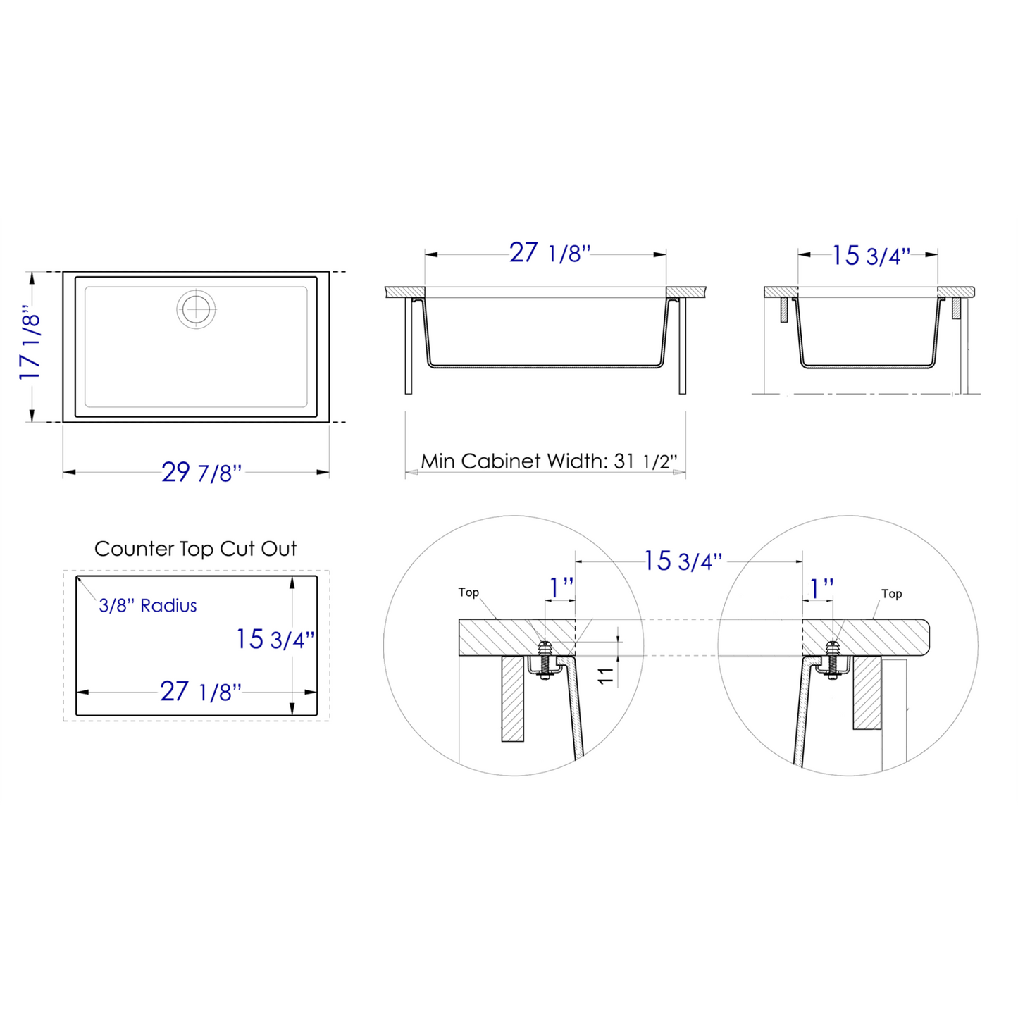 - Recommended counter top cut out hole of 27 1/8" x 15 3/4" with a 3/8" corner radius.