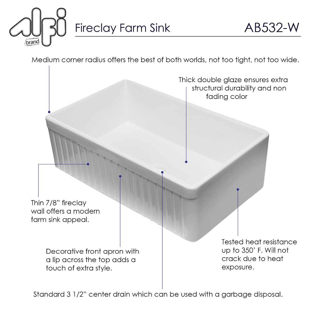 ALFI brand fireclay farm sinks are a throwback to a simpler time. Designed to offer the traditional popular look of an apron farm sink with a contemporary twist. Made of the highest quality solid fireclay to ensure it not only looks great but also lasts for a very long time.