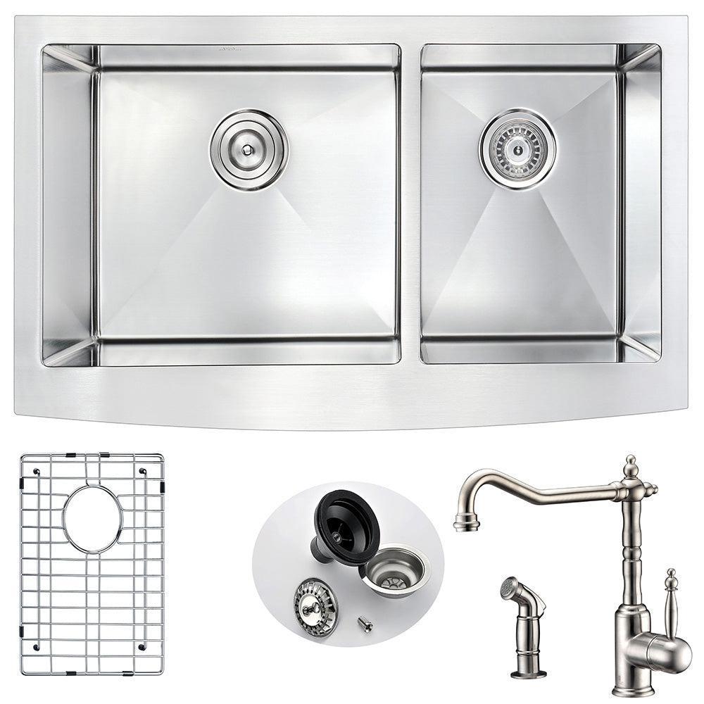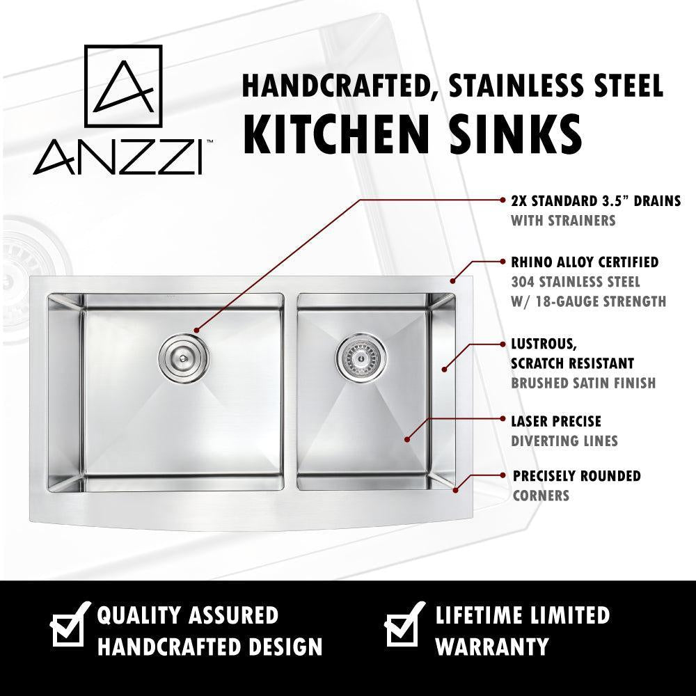 ANZZI presents the 36 in. ELYSIAN SERIES hand crafted farmhouse kitchen sink. Representing the latest in modern home fixture designs and traditional European crafting technique this stunning display of artistry is hand shaped to perfection using RHINO ALLOY certified 18-Gauge 304 stainless steel. Only ANZZI hand crafted farmhouse kitchen sinks utilize RHINO ALLOY certified materials for superior strength and quality. The cavernous 60/40 deep soaking dual basin will comfortably accommodate the largest dish loads including pots, pans and more. And every ANZZI sink features extra-large Echo-STOP sound dampening pads and a layer of protective composite coating to further quiet noise and prevent condensation. We have paired this sink with the ANZZI Locke Kitchen Sink Faucet. Each ANZZI faucet has been certified as Water Sense approved with solid brass construction and valve included. Well defined diversion lines ensure quick and total water drainage and the subtly curved corners allow of easier cleaning. ANZZI carries a proud tradition of crafting long lasting, quality home fixtures. With ANZZI perfection is our tradition.