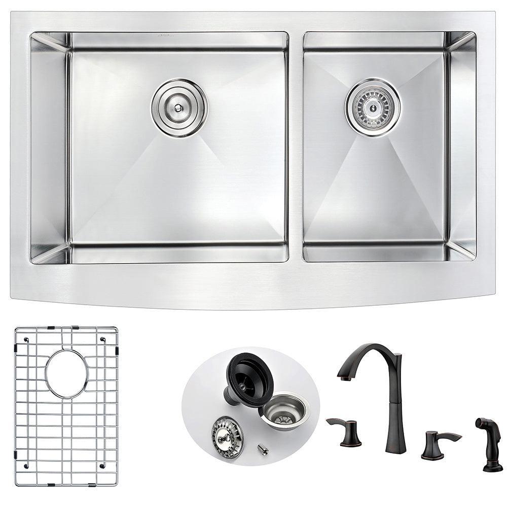 ANZZI Elysian Series 36" Double Basin 60/40 Stainless Steel Farmhouse Kitchen Sink With Strainer and Oil Rubbed Bronze Soave Faucet
