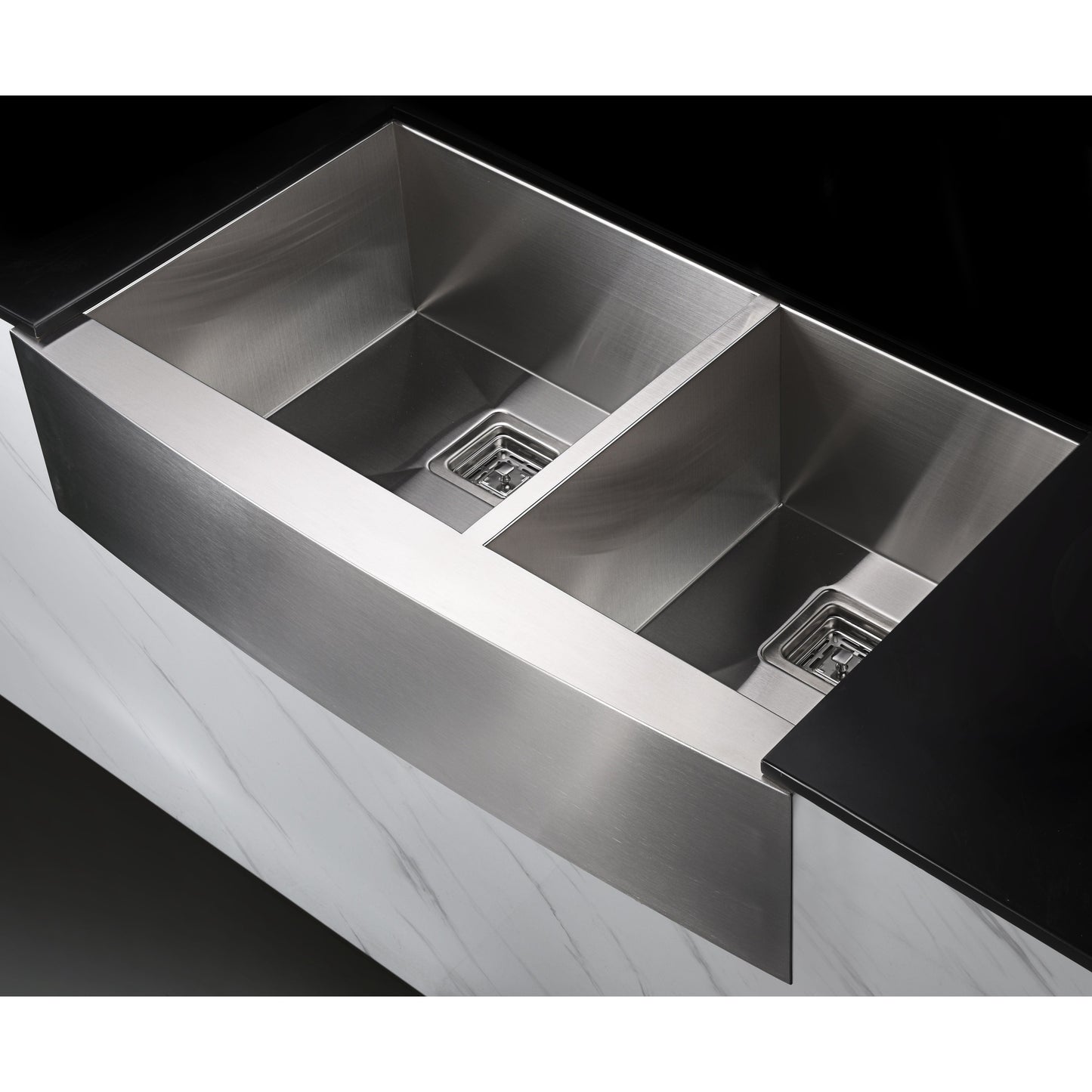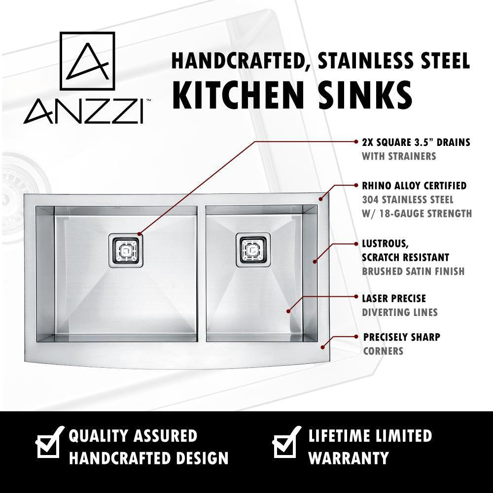 ANZZI presents the 36 inch ELYSIAN SERIES hand crafted farmhouse kitchen sink. Representing the latest in modern home fixture designs and traditional European crafting technique this stunning display of artistry is hand shaped to perfection using RHINO ALLOY certified 18 gauge 304 stainless steel. Only ANZZI hand crafted farmhouse kitchen sinks utilize RHINO ALLOY certified materials for superior strength and quality. The cavernous 60/40 deep soaking dual basin will comfortably accommodate the largest dish loads including pots, pans and more. And every ANZZI sink features the largest Echo-STOP sound dampening pads available and a layer of protective composite coating to further quiet noise and prevent condensation. Well defined diversion lines ensure quick and total water drainage and the subtly curved corners allow of easier cleaning. ANZZI carries a proud tradition of crafting long lasting, quality home fixtures. Included with your kitchen sink is one of our premium faucets. ANZZI is committed to introducing the latest in European bath fixture design to the North American home. ANZZI presents the Singer Pull Down Single Handle Kitchen Faucet. Crafted using lead-free RHINO ALLOY certified brass as the interior and our Lustrous Brushed Nickel rust resistant finish. With ANZZI perfection is our tradition.